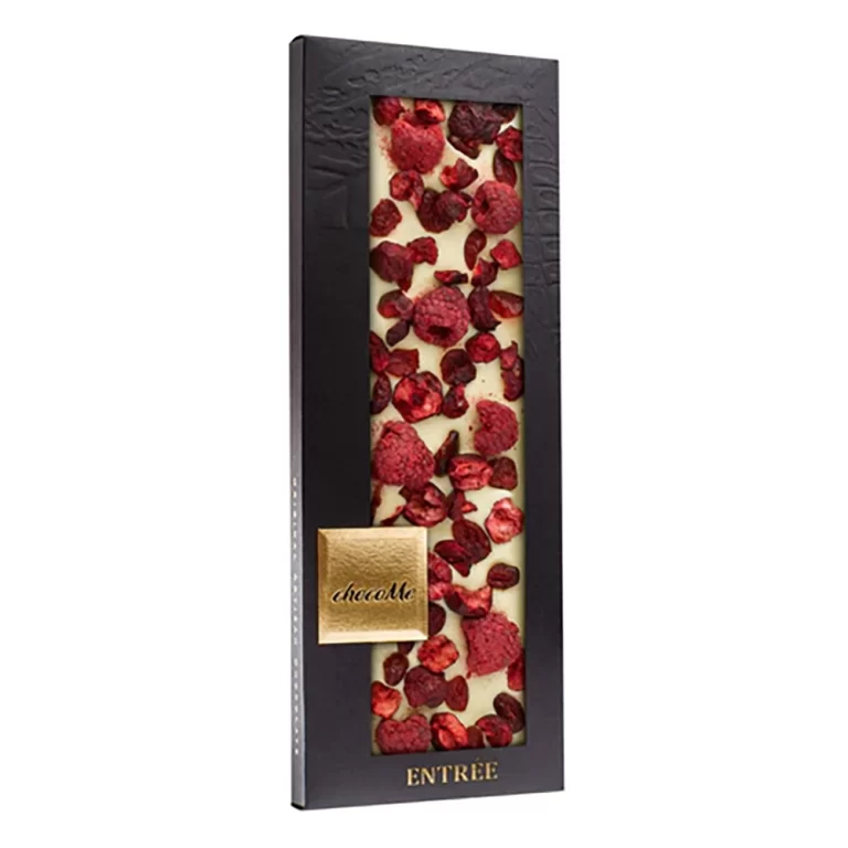 Enjoy the sweet dream of chocoMe white chocolate, enriched with lingonberry, freeze-dried cherry and freeze-dried raspberry.